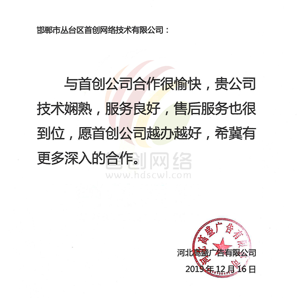 與首創(chuàng)公司合作很愉快,貴公司技術(shù)嫻熟,服務(wù)良好,售后服務(wù)也很到位,愿首創(chuàng)公司越辦越好,希冀有更多深入的合作。
